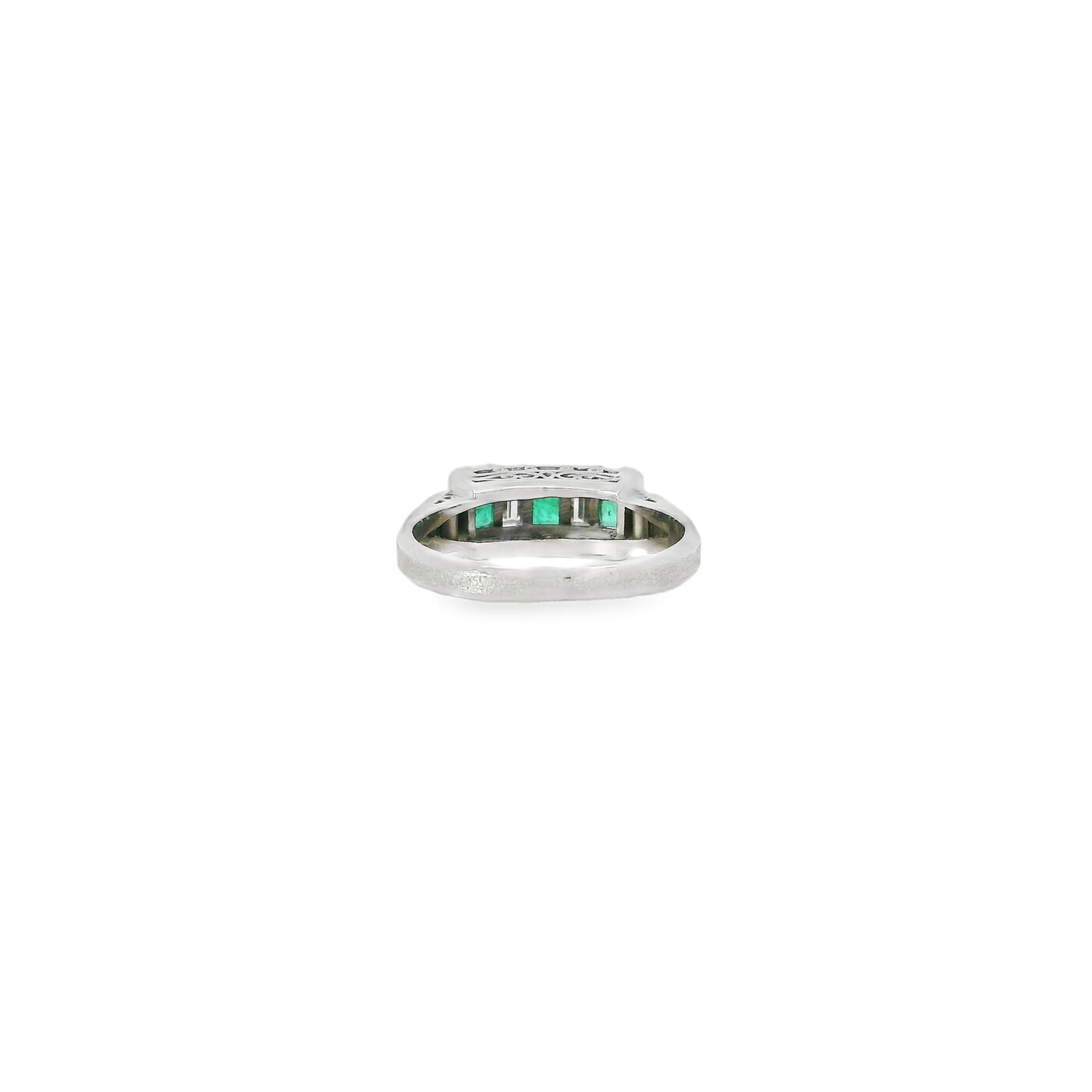 Stones: (3) Emerald Cut Columbian Emeralds equaling .54 Carats Transparent Green (2) Emerald Cut Diamonds equaling .29 Carats F Color VS1 Clarity with a Textured Shank