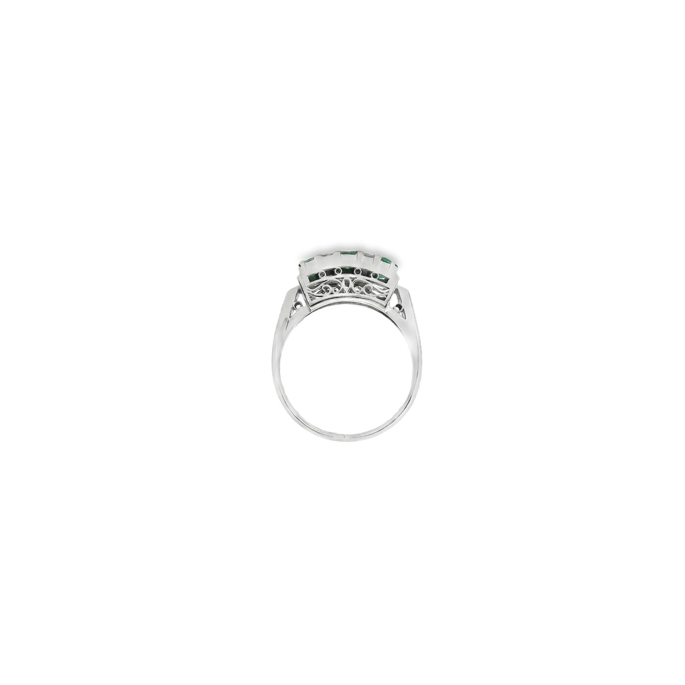 ITEM#: GCB00009410This platinum ring features an emerald and diamonds in a textured bar-style setting. The design combines refined detail with timeless elegance for a sophisticated look.