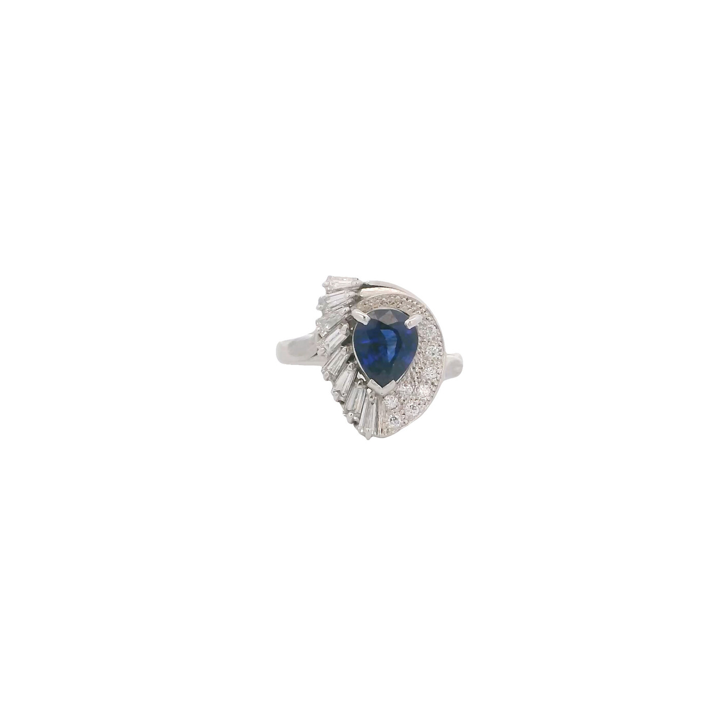 Stones: (1) Pear Shaped Natural Blue Sapphire weighing 1.22 Carats AA Quality Royal Blue Color & (8) Brilliant Round Cut Diamonds & (8) Baguette Cut Diamonds equaling .48 Carats F-G Color VS2-SI1 Clarity
