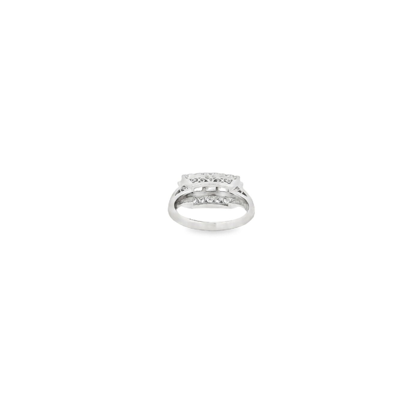 A 1960s platinum bar style ring set with a mix of asscher and round diamonds. The structured layout gives it a timeless, architectural look.