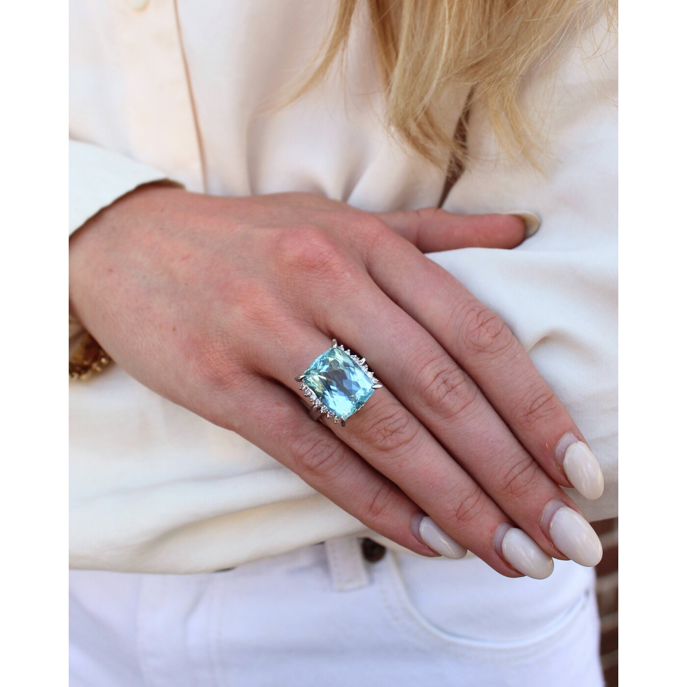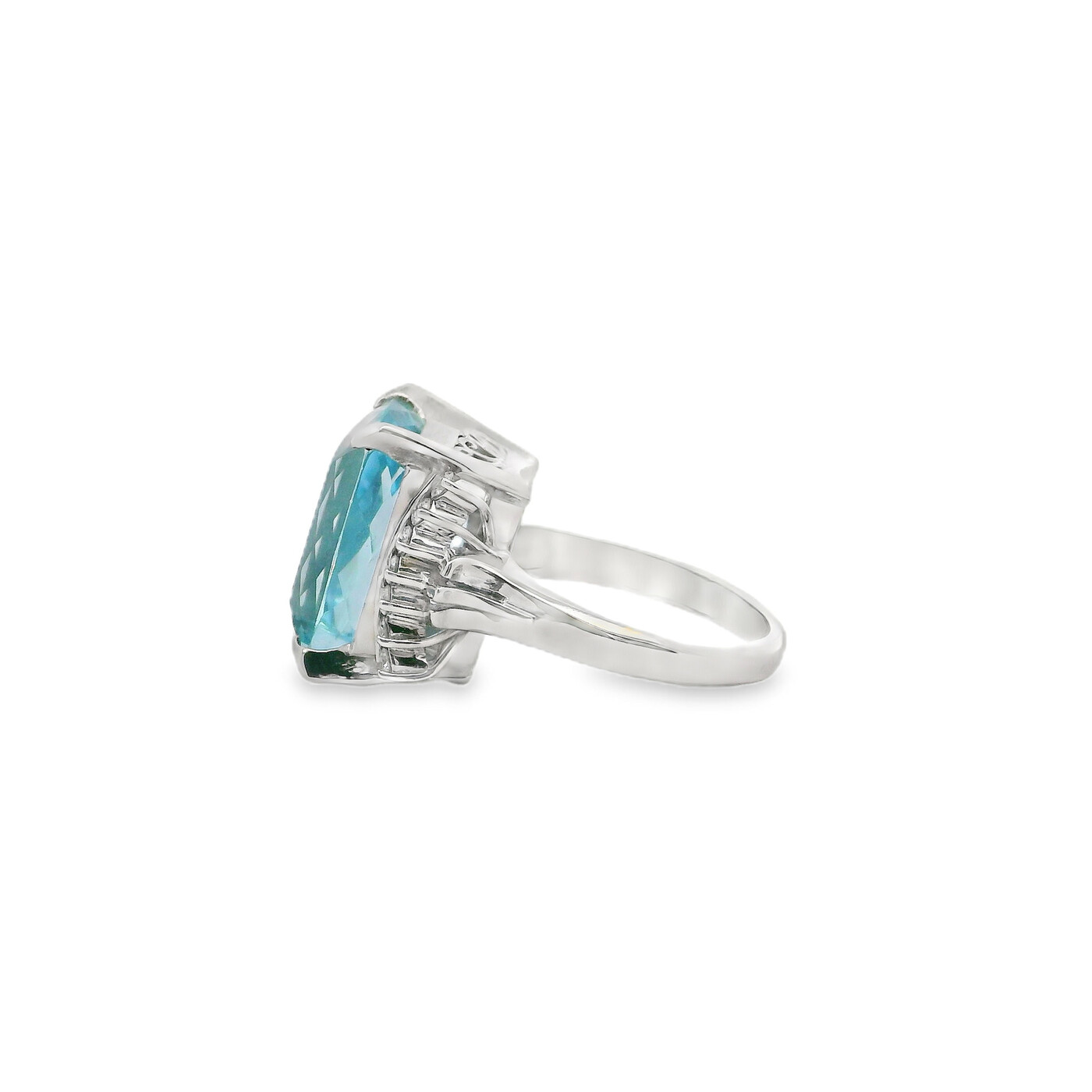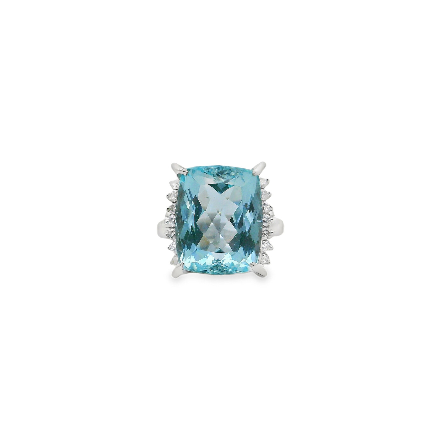 ITEM#: GCB00009415This platinum ring showcases an elongated cushion aquamarine accented by diamonds. The design emphasizes the gemstone’s serene blue color, creating a timeless and elegant statement piece.