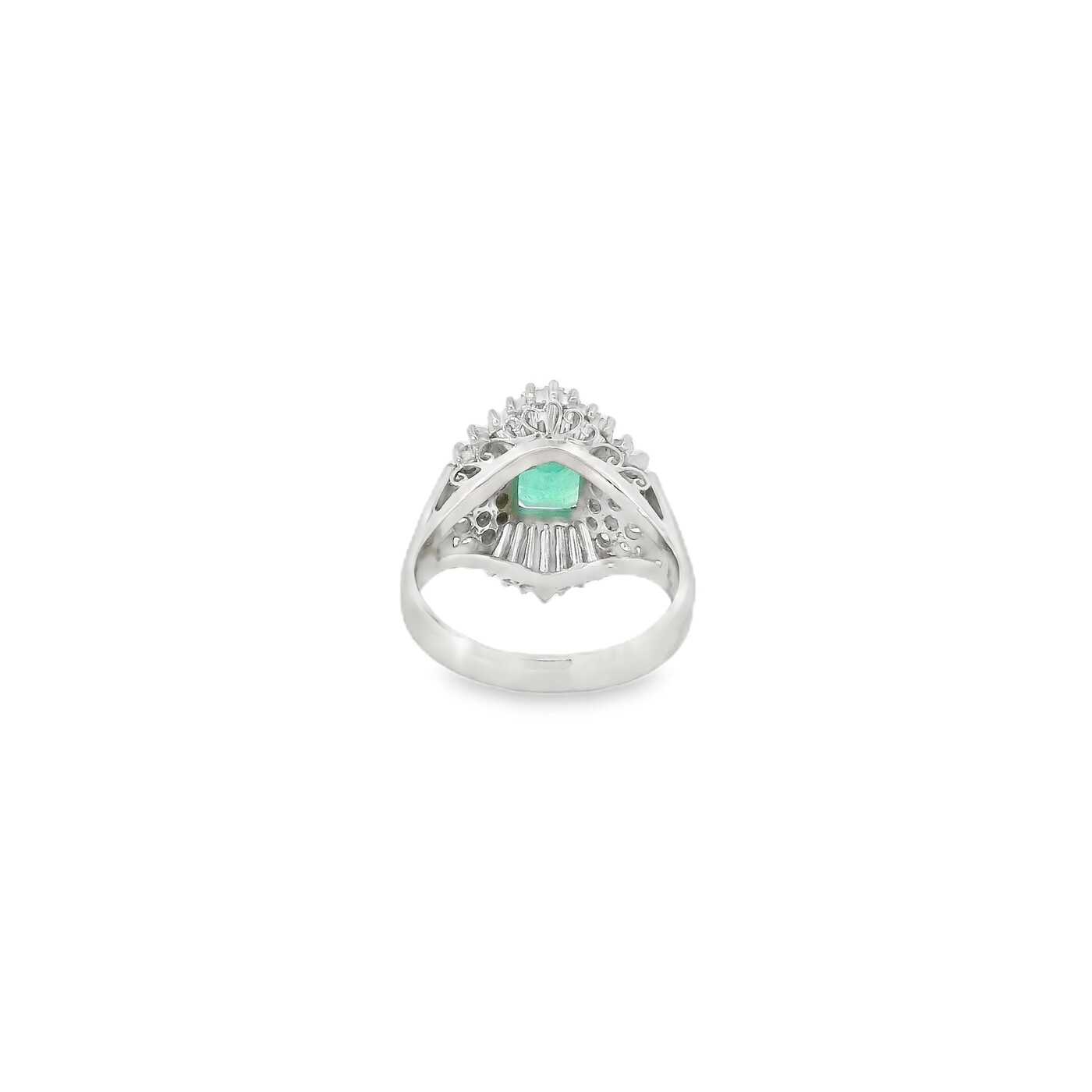 Stones: (1) Natural Columbian Emerald Cut Emerald weighing 1.48 Carats Four Prong Set Transparent Green Color (some pitting seen on stone due to age-price reflects wear) & Baguette Cut Diamonds & Round Cut Diamonds equaling 1.18 Carats G-H Color SI1-SI2 Clarity