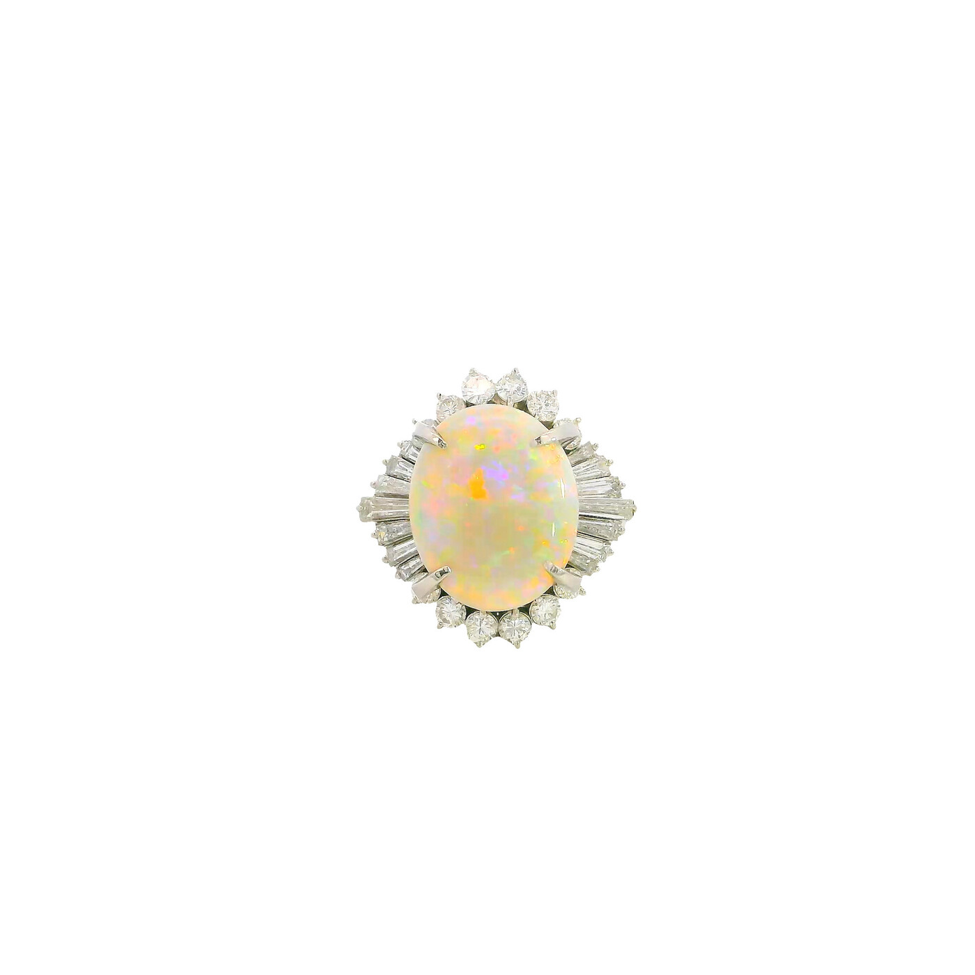 Stones: (1) Oval Cabochon Cut Australian Opal weighing 2.96 Carats Four Prong Set & (14) Tapered Baguette Cut Diamonds & (12) Round Cut Diamonds equaling 1.23 Carats F-G Color VS2-SI1 Clarity