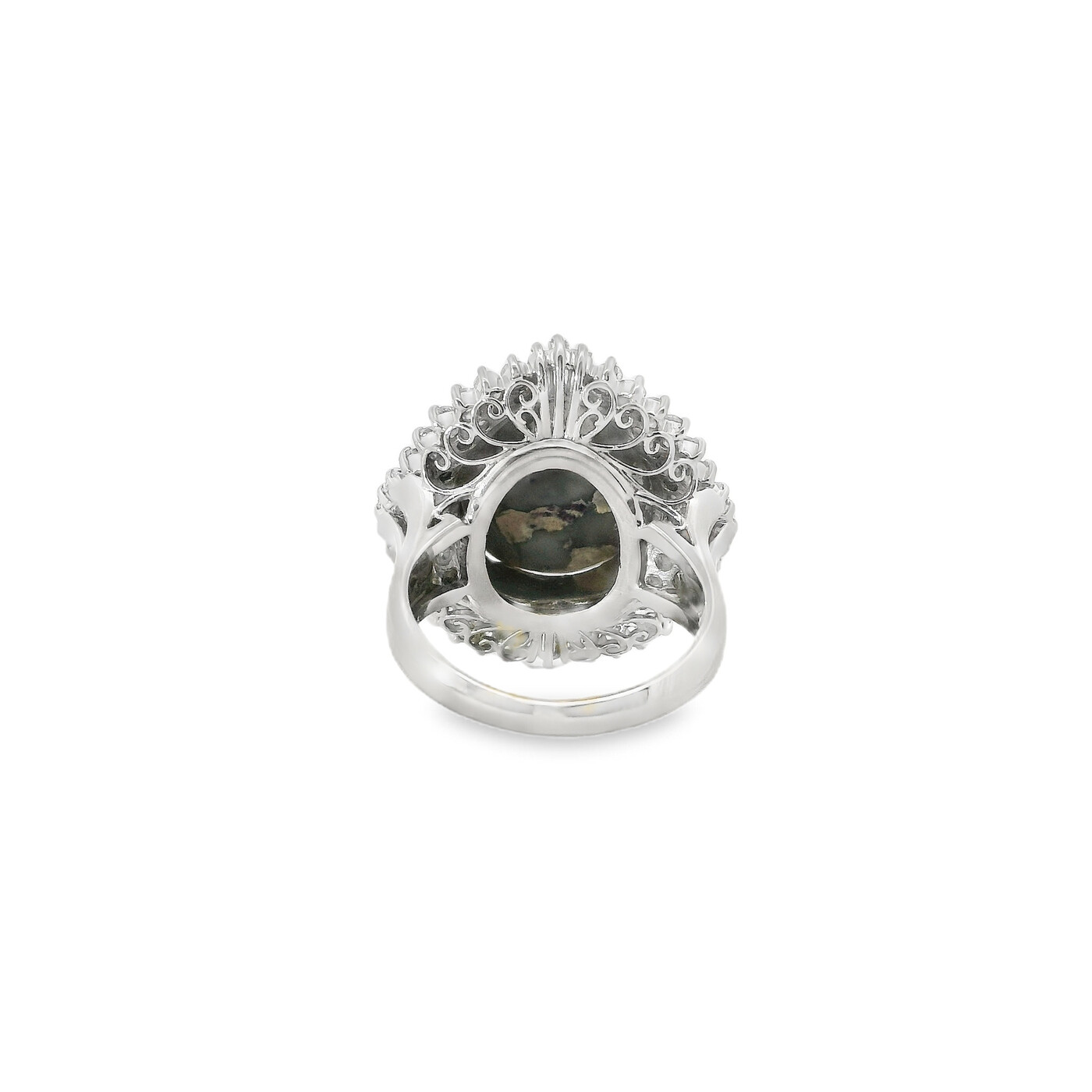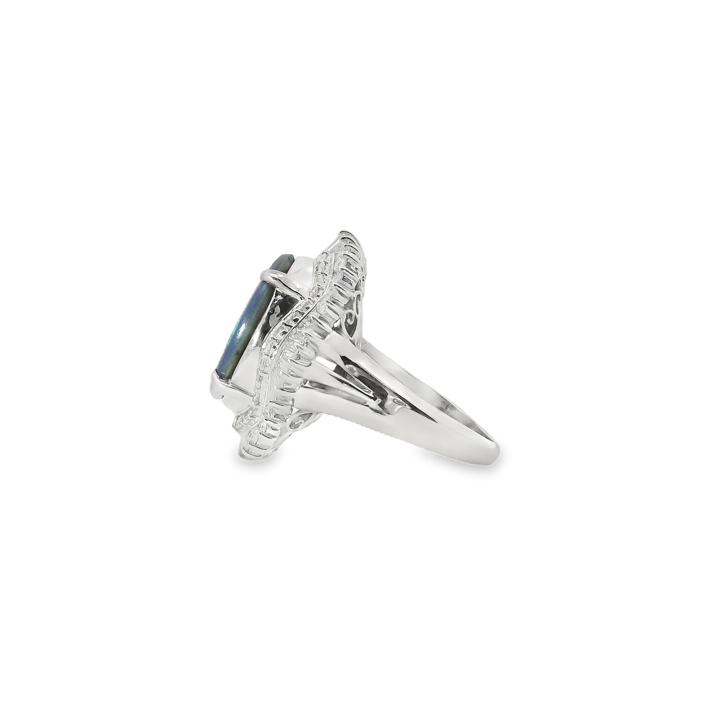 ITEM#: GCB00009417This platinum ring features an oval black opal surrounded by a ballerina halo of diamonds. The design highlights the opal’s vivid colors with refined and timeless elegance.