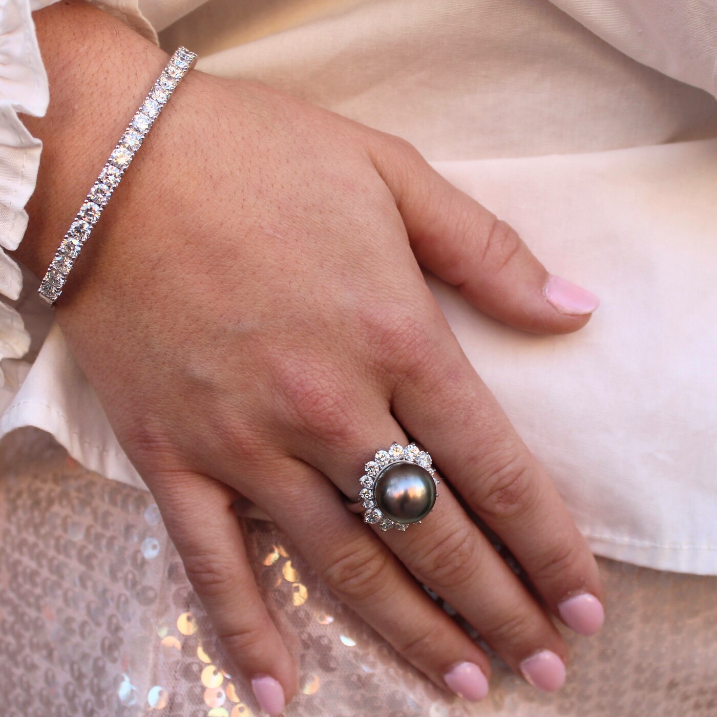 ITEM#: GCB00009389This platinum ring showcases a Tahitian pearl framed by a halo of sparkling diamonds. The design combines striking color with timeless elegance.