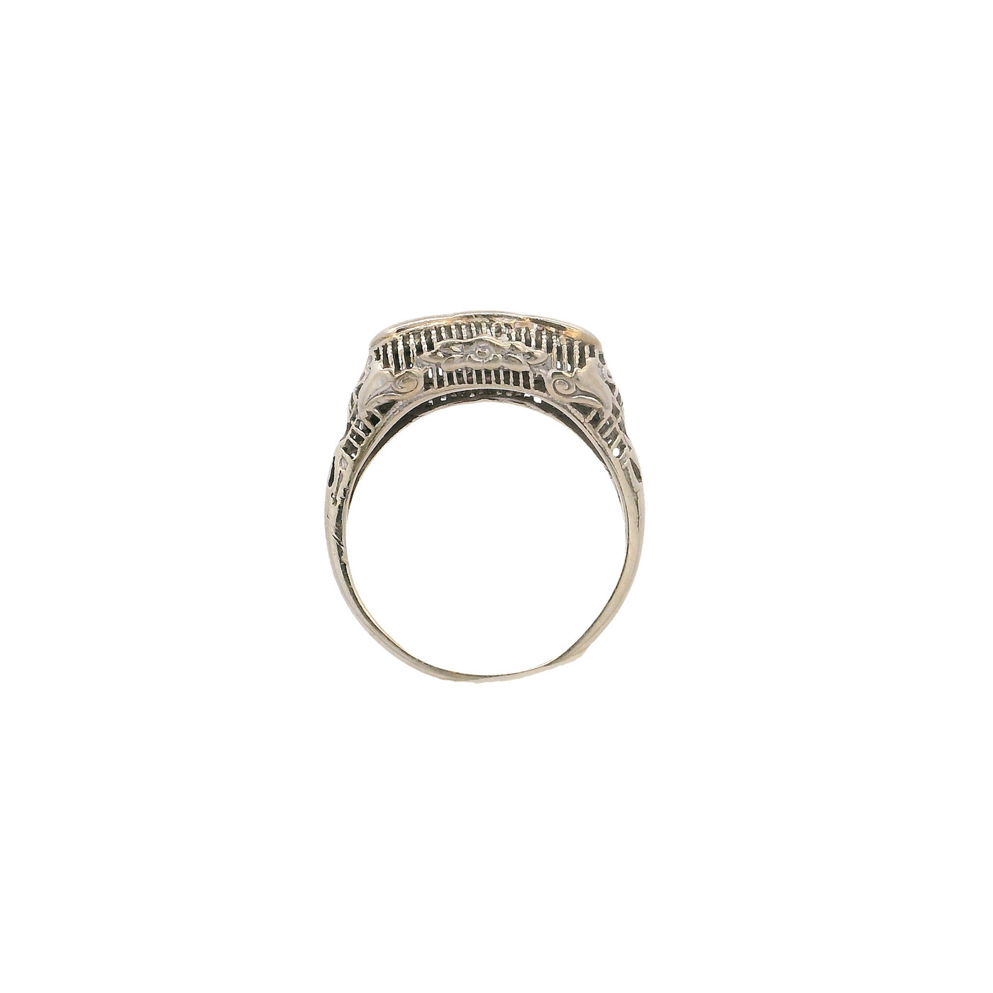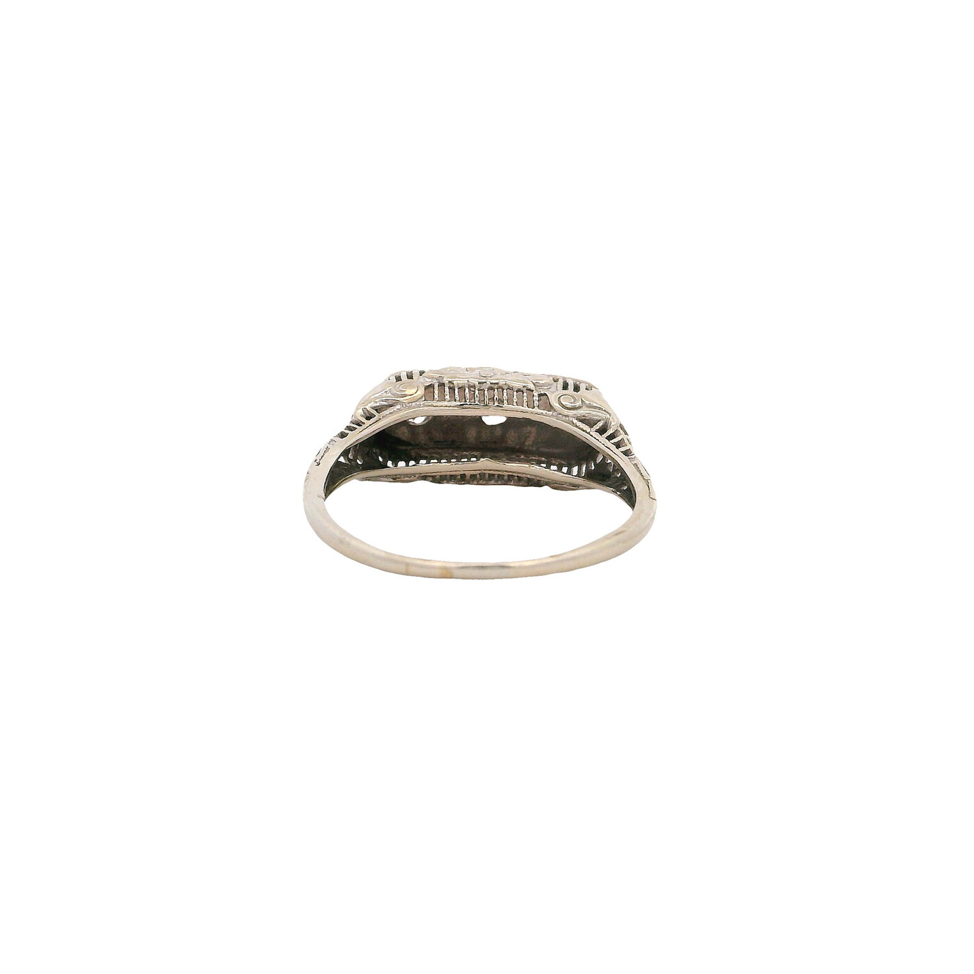 $675.00A true nod to vintage elegance, this 1930s Art Deco ring features intricate filigree detailing and three single cut diamond totaling .25 carats. Crafted in white gold, its geometric lines and delicate design capture the timeless beauty of the Deco era.