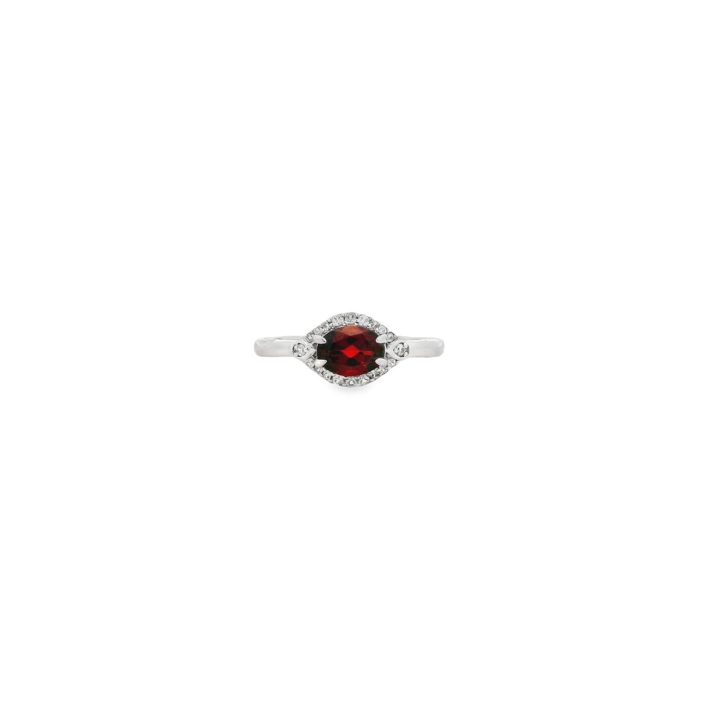 This sterling silver ring features an oval garnet set east to west, accented with white zircon for added sparkle. The deep red stone paired with a modern setting creates a bold yet refined look perfect for everyday wear or stacking.
