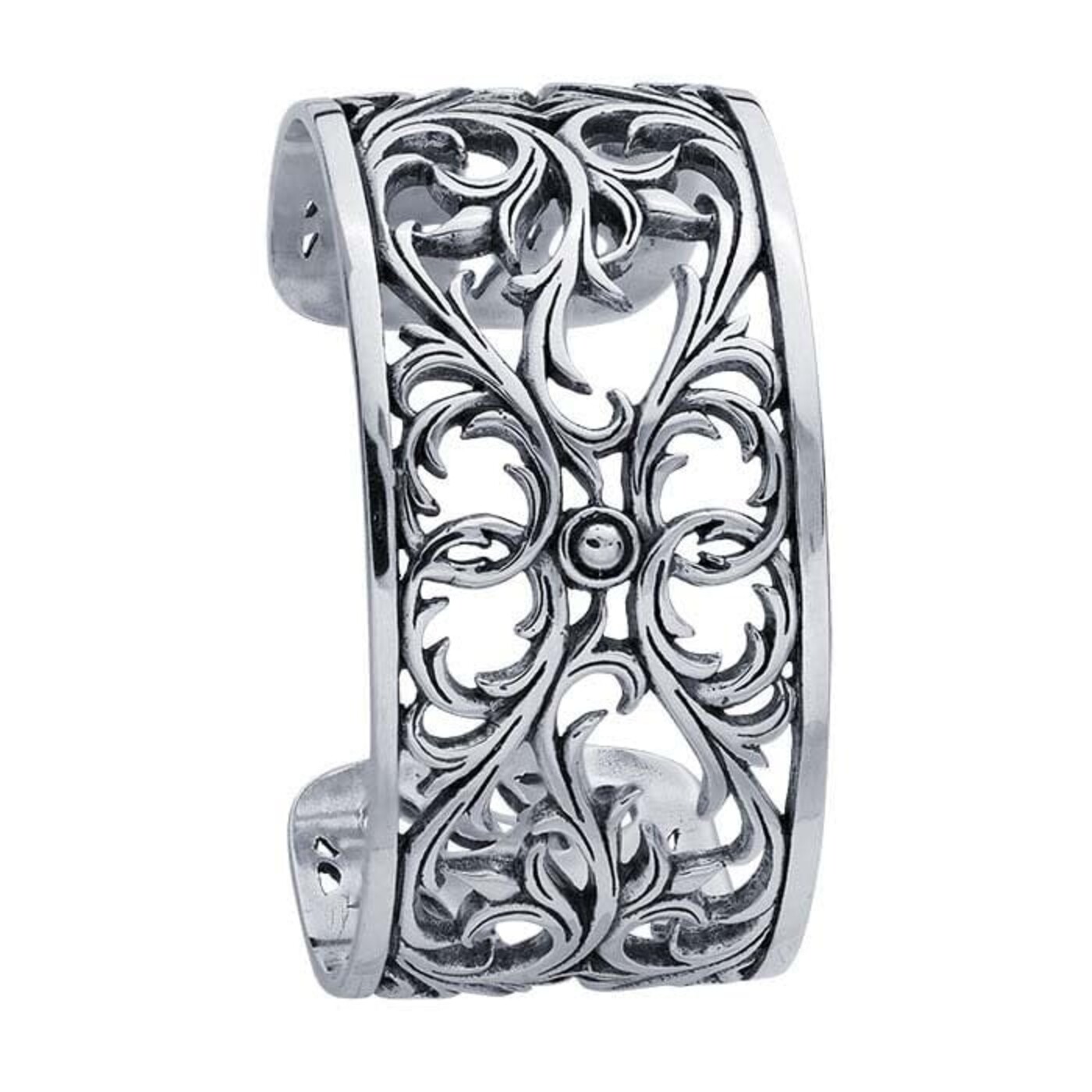 This sterling silver cuff features a Charleston gate-inspired design with polished detailing. Its elegant, openwork style offers a timeless and versatile accent for any collection.